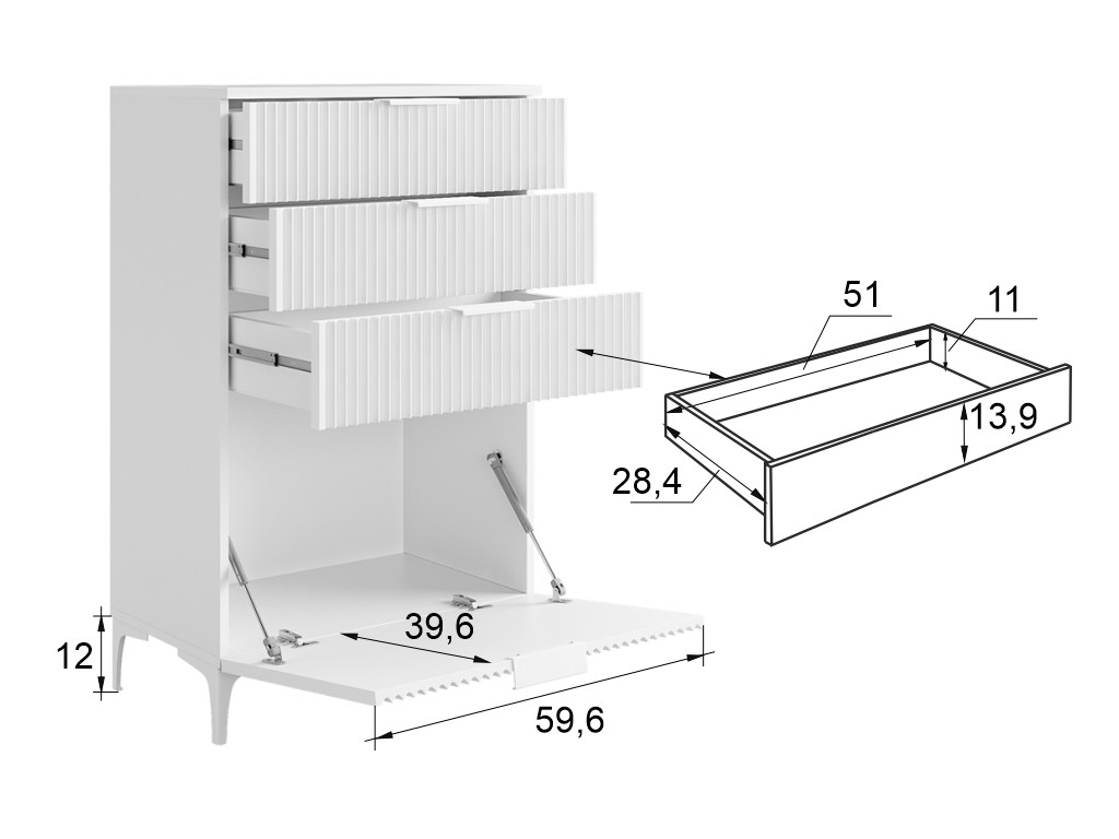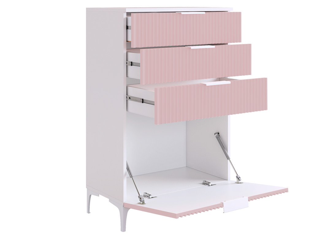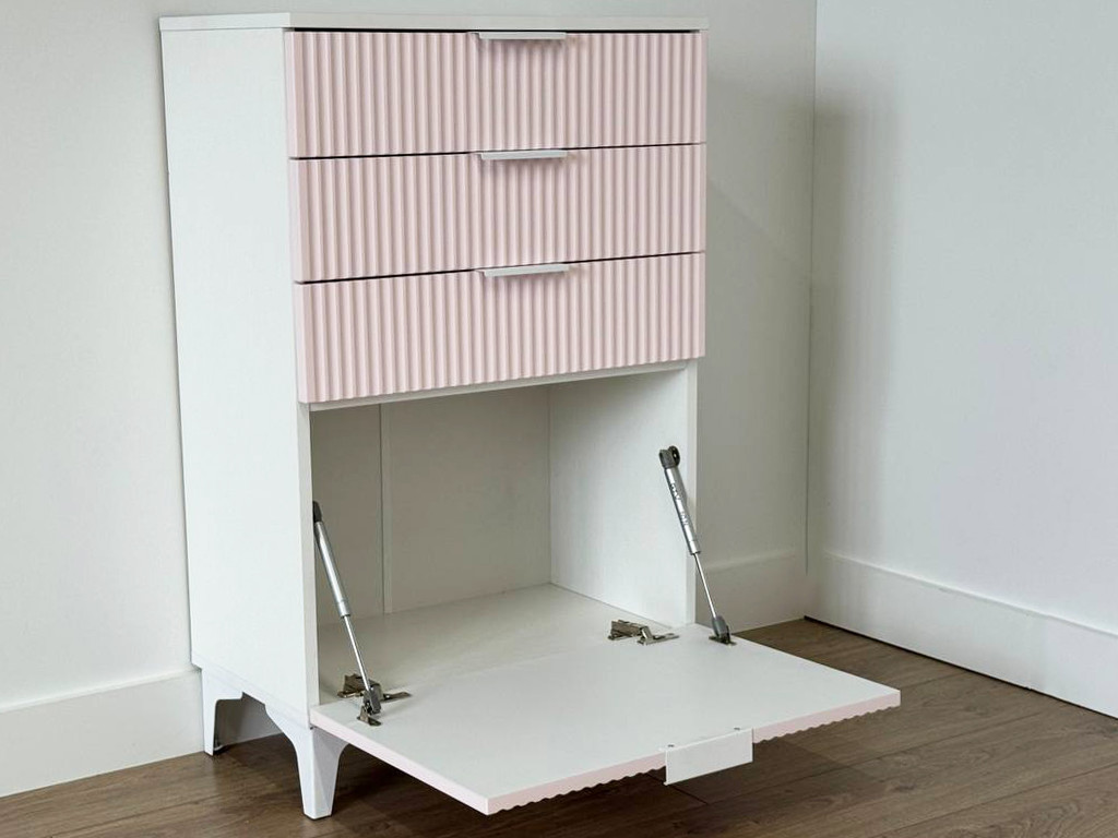 Комод «Зефир» — идеальное решение для детской и гостиной комнат. Он оснащён выкатными ящиками и откидной секцией, обеспечивая максимальный комфорт и удобство использования. Фасады украшены изящной фрезеровкой, которая придаёт изделию неповторимый шарм и элегантность.