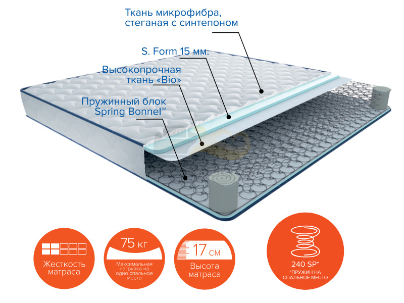 Наполнение: Зависимый пружинный блок "Spring Bonnel" (240 пружин на спальное место) + высокопрочная ткань "Bio" + ортопедическая пена S.Form 1,5 см