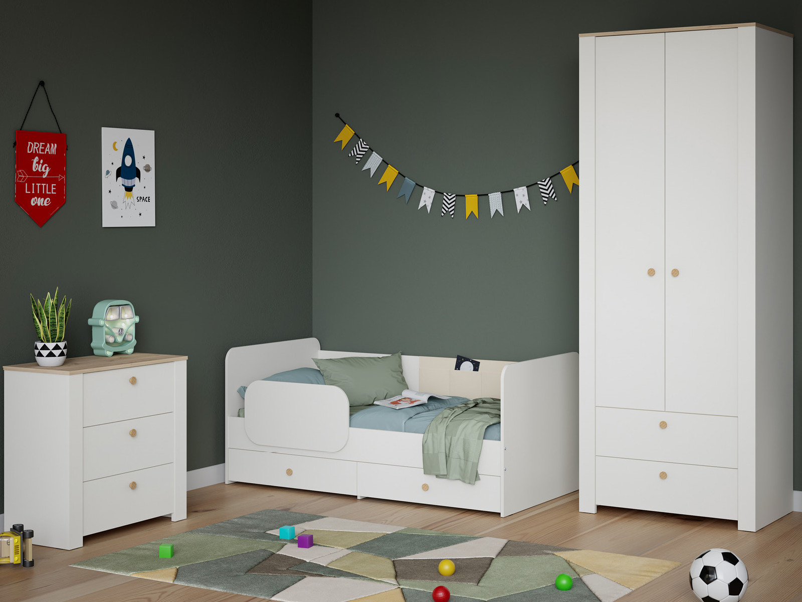 Цена за комплект: Кровать 11.55, Бортик универсальный 17.51, Комод 16.228.03, Шкаф для одежды 13.339
