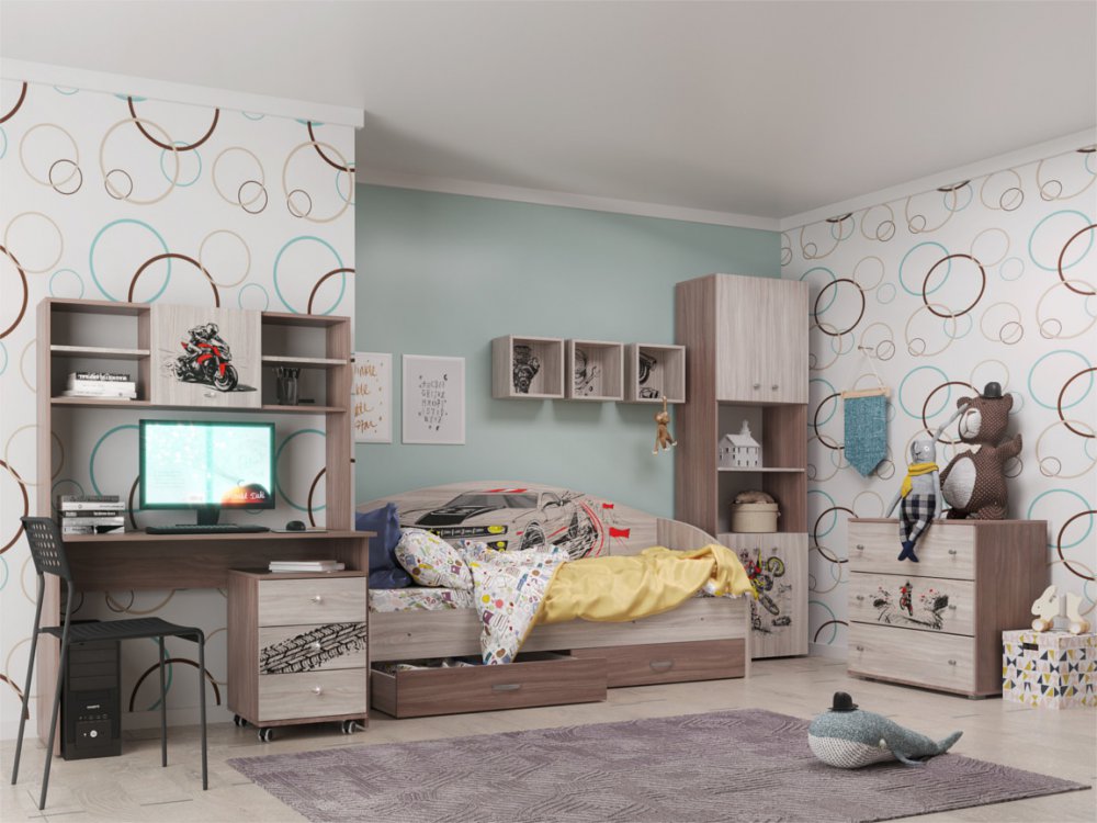 Цена указана за комплект на фото: Стол письменный, надстройка, тумба. комод, Кровать на ламелях, Шкаф 600 4Д, Полки навесные 3 шт с фотопечатью