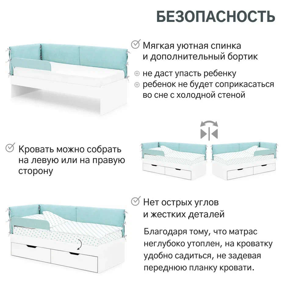 Чтобы не бояться, что ребенок упадет с кроватки, можно приобрести дополнительный съемный бортик.