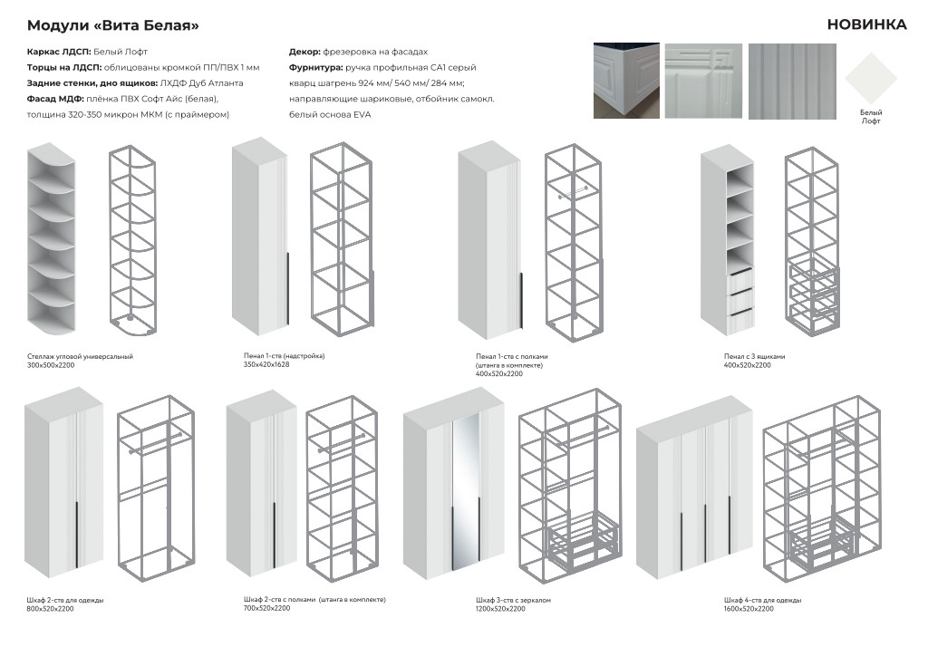 - Фасад: МДФ с фрезеровкой, плёнка ПВХ толщина 320-350 микрон МКМ (с праймером)