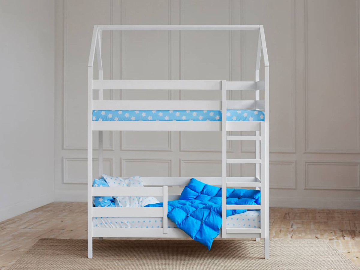 Передний бортик (съёмный, высота 39 см) на нижнем ярусе и лестница — универсальные, установка слева/справа.
