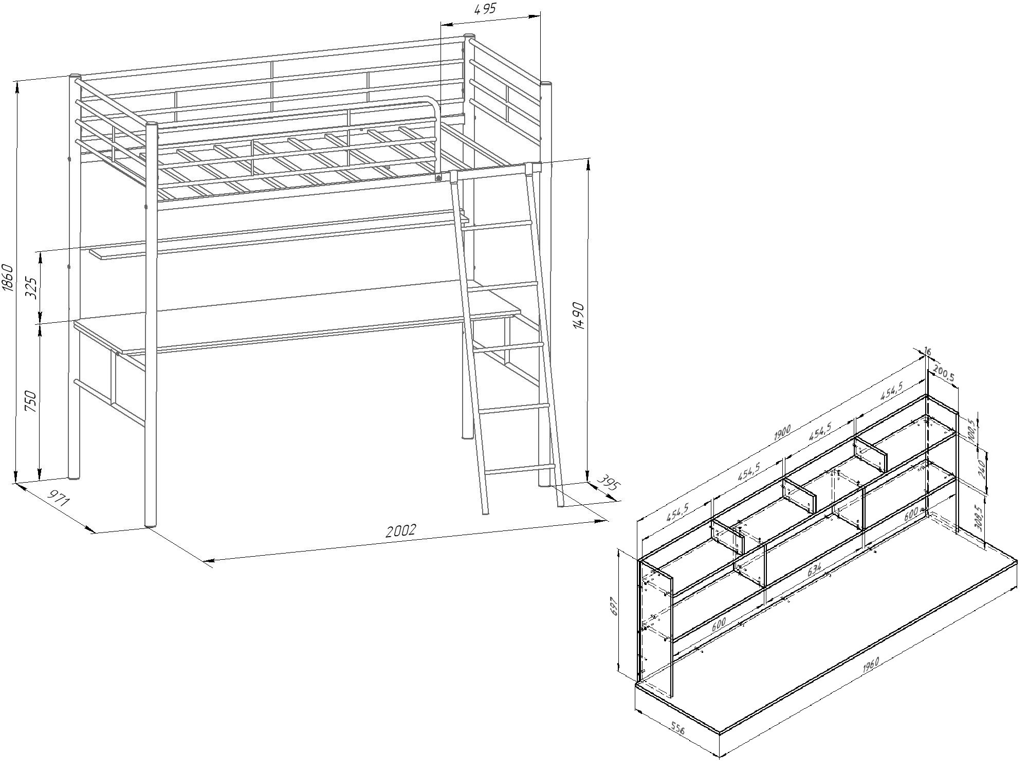 Ширина верхнего спального места: 900х1900 мм