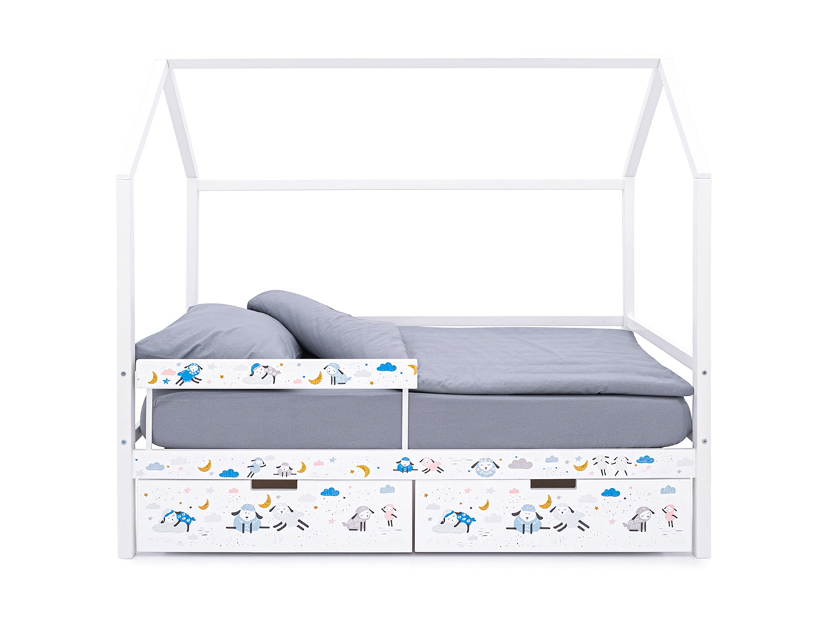 Кровать-домик Svogen с фото с ящиками и бортиком белый/барашки