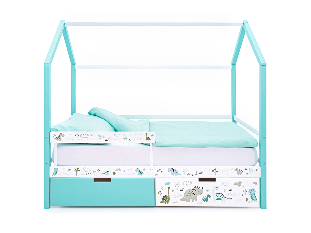 Кровать-домик Svogen с фото с ящиками и бортиком мятный/динозаврики