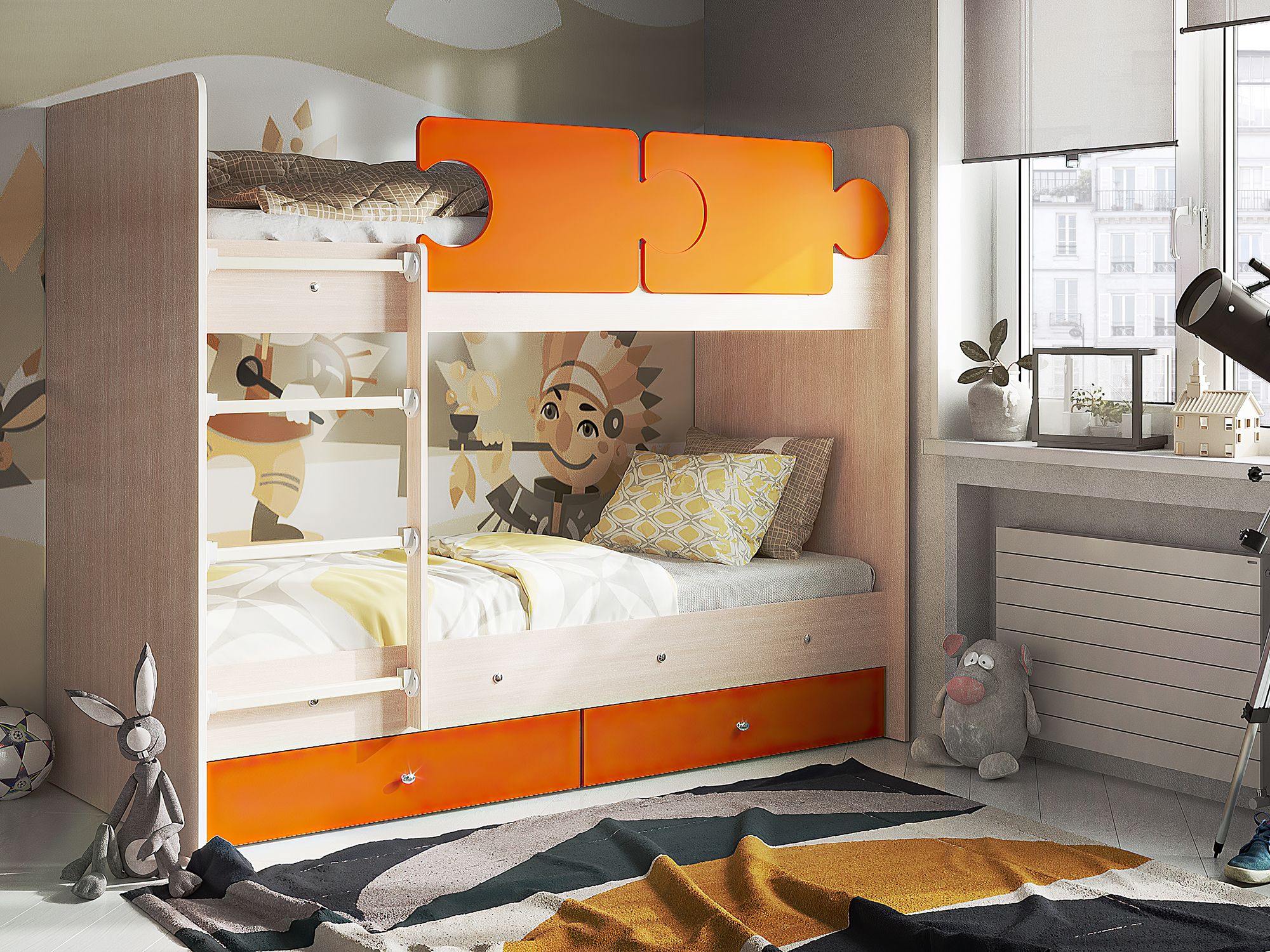 - Кровать двухъярусная Тетрис латы с бортиками дуб млечный-оранжевый