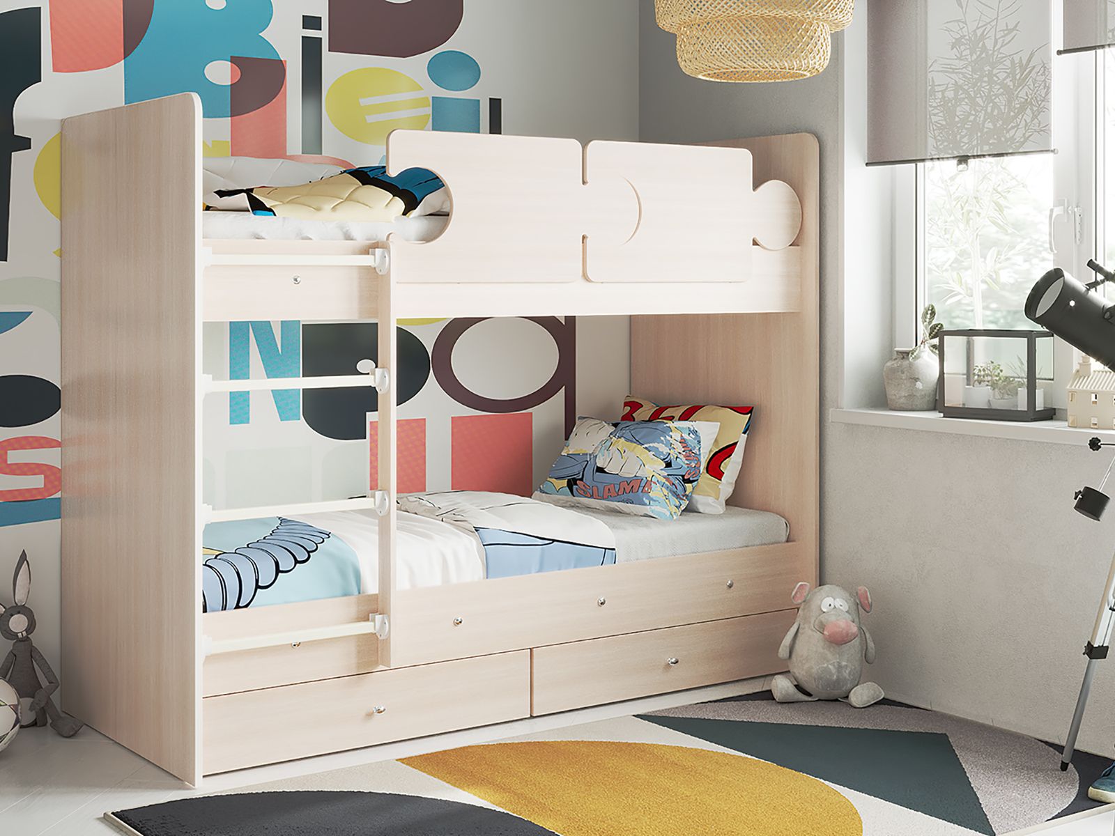 - Кровать двухъярусная Тетрис латы с бортиками дуб млечный