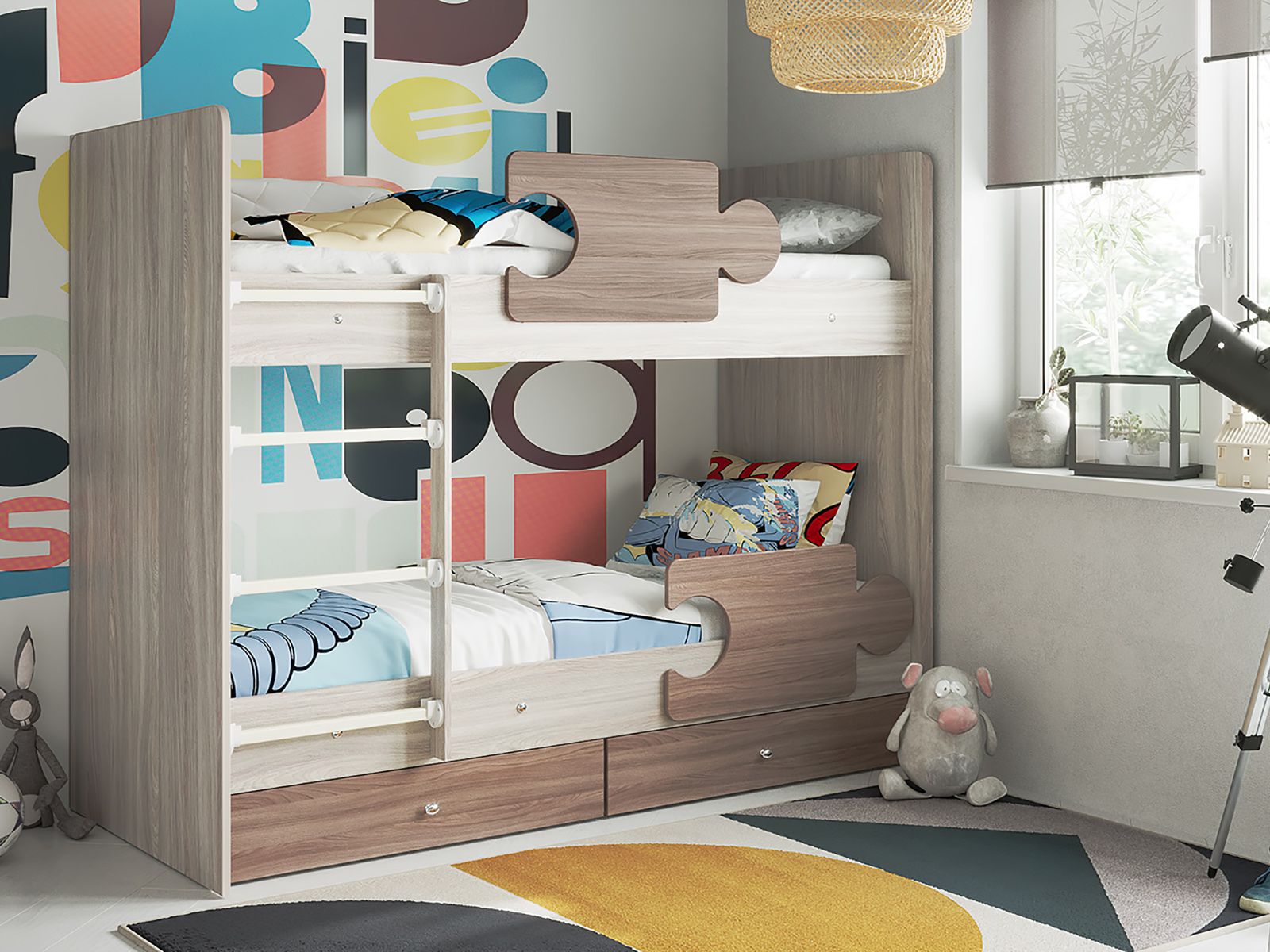 - Кровать двухъярусная Тетрис латы с бортиками ясень шимо