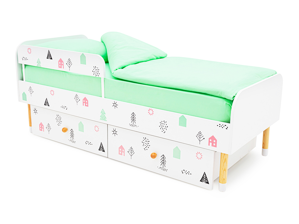 - Кровать Stumpa Классика с бортиком и ящиками Домики розовый, бирюзовый