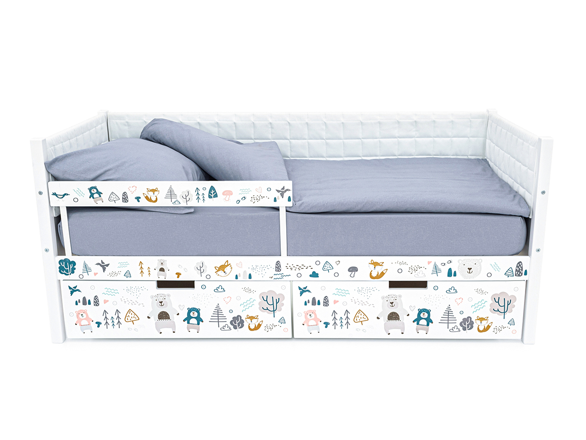 Кровать-тахта Svogen мягкая с ящиками и бортиком с фото белый/мишки