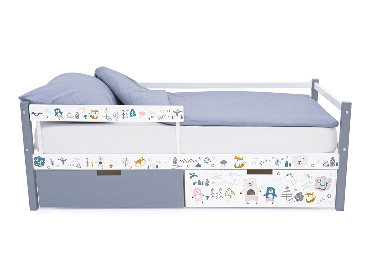 Кровать-тахта Svogen с ящиками и бортиком с фотопечатью графит-белый/мишки