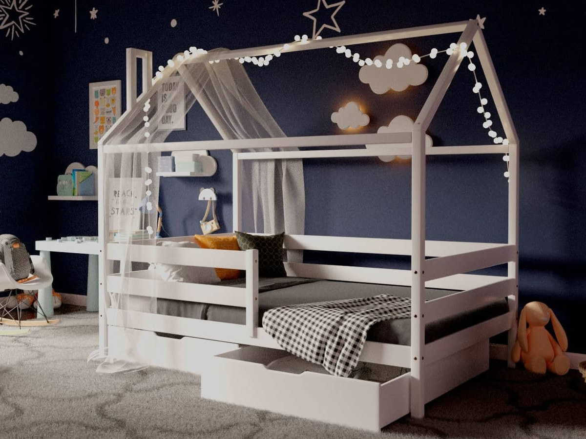 - Кроватка-Домик белый 80х190 см с ящиками
