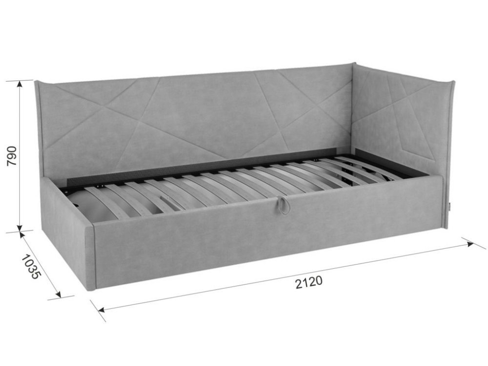 Основание подъемное входит в комплект кровати, петелька для подъема в цвет ткани на корпусе. Кровать имеет огромный ящик для хранения.