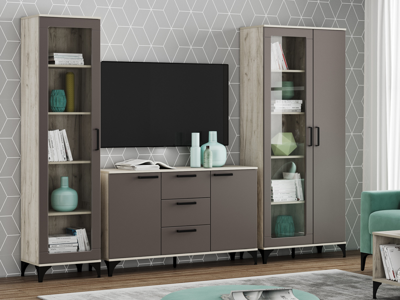 - Гостиная Марсель Софт Графит, корпус Дуб Крафт Серый
