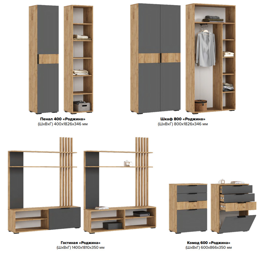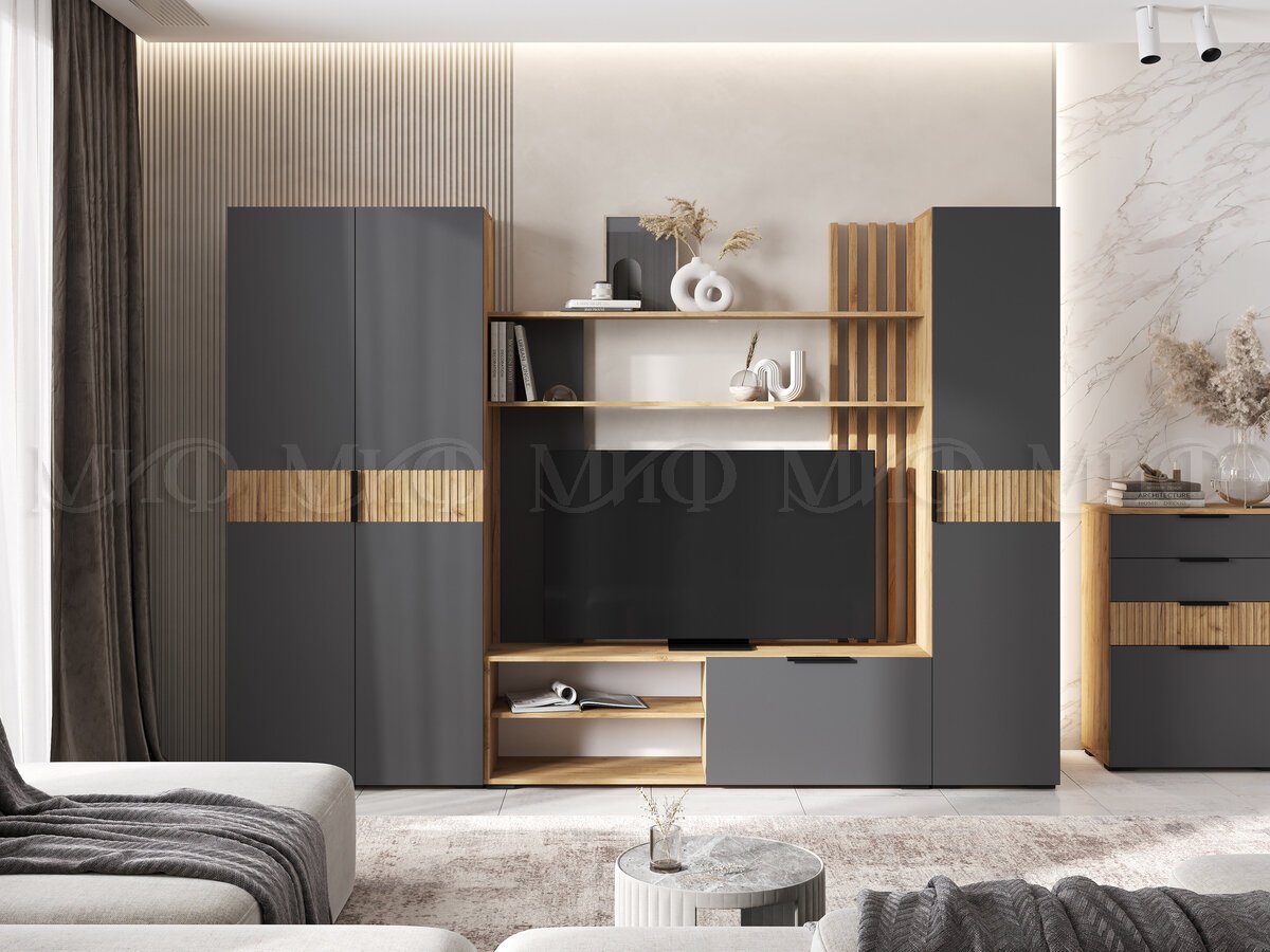 - Гостиная модульная Роджина Графит, Дуб Крафт