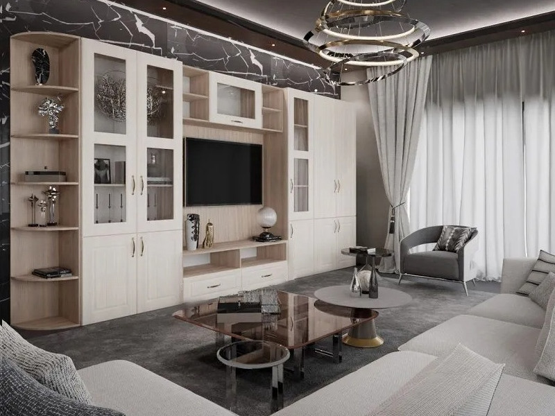 Состав комплекта: Пенал (стекло), Стеллаж угловой, Тумба ТВ, Шкаф навесной, Шкаф-900, Шкаф-900 (стекло)