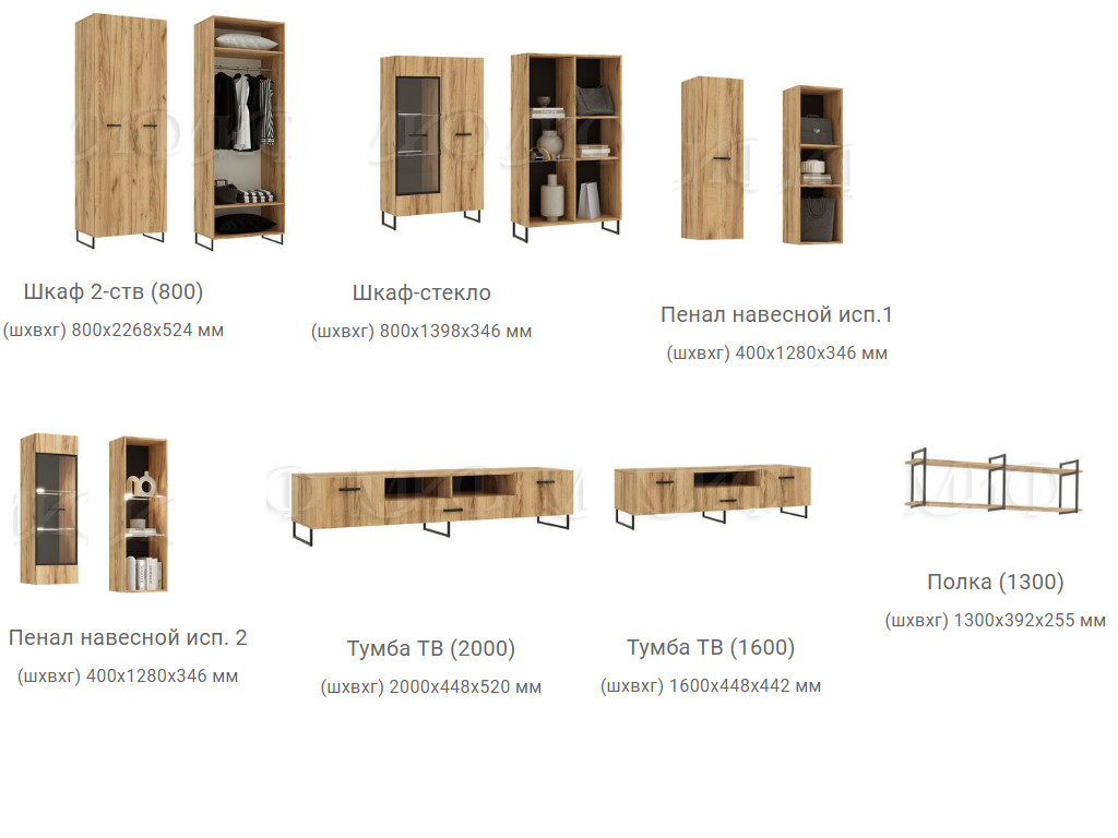 Цена за комплект без подсветки: Шкаф 2-х створчатый, Полка, Тумба ТВ 2000, Пенал навесной (исп1), Пенал-стекло навесной (исп2)