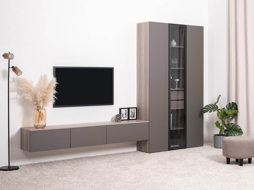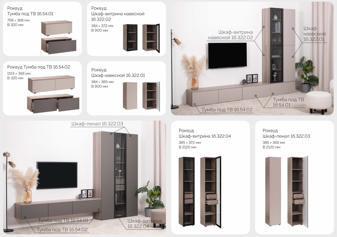 Цена за комплект: Тумба под ТВ 16.54.01, Тумба под ТВ 16.54.02, Шкаф-витрина 16.322.04,Шкаф-пенал 16.322.03 (2 шт)