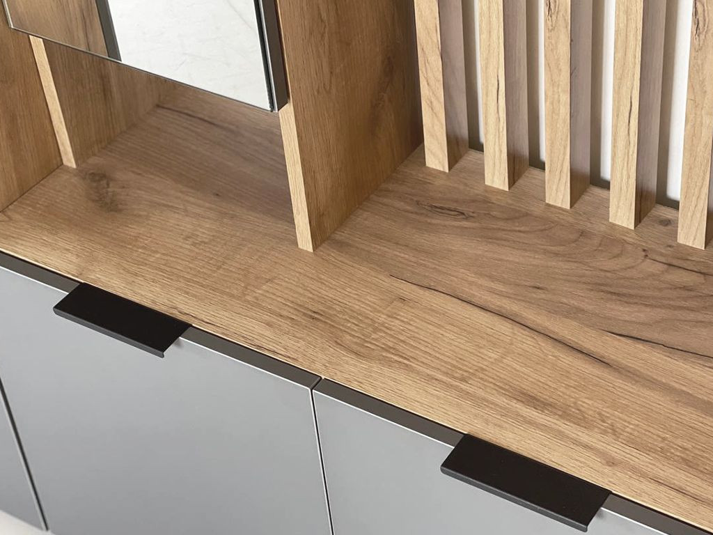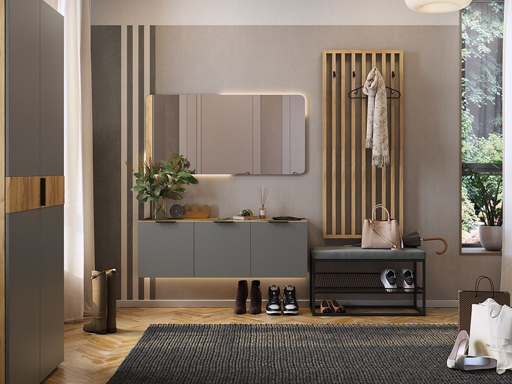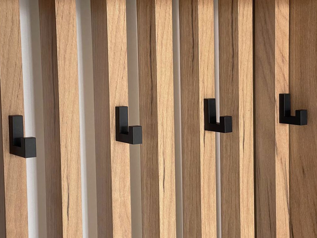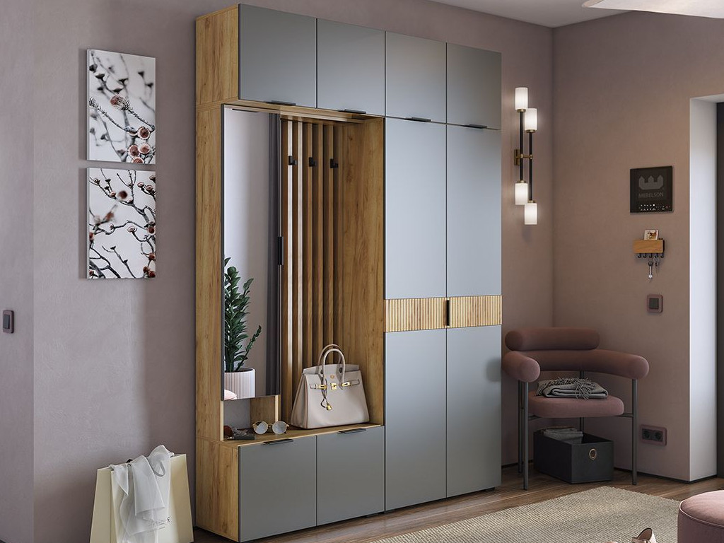 Стильные, трендовые рейки МДФ, акцентные крючки, зеркало, в котором можно себя увидеть в полный рост, полки для мелочей и головных уборов, а так же внузу большой шкаф для обуви, самые актуальные и ценные моменты для прихожей.