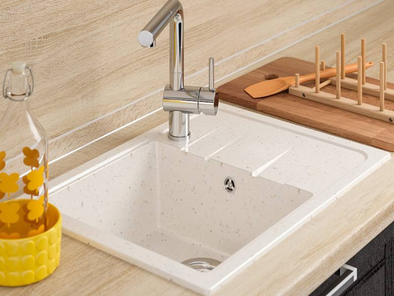 - Изготовленная из прочного искусственного кварцевого камня, мойка отличается долговечностью и надежностью. Этот материал устойчив к различным видам повреждений и выдерживает высокие температуры.