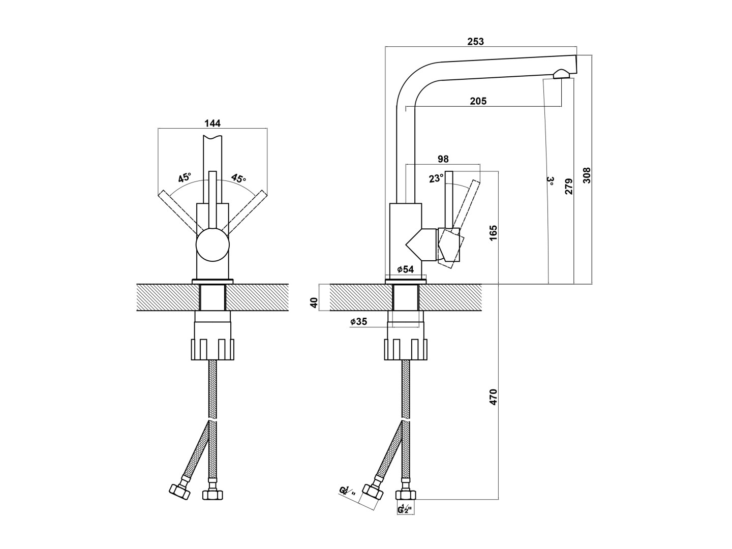 Высокий поворотный излив. Современный дизайн изделия. Гибкая подводка 45 см в комплекте. Усиленная гайка крепления смесителя.