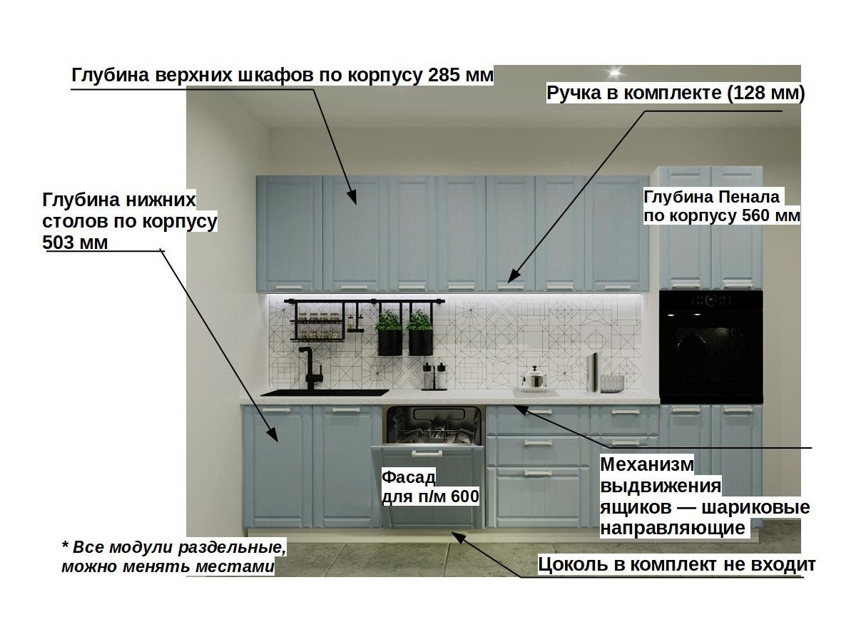 Кухонная мойка, стеновая панель, посудосушитель, планки для столешницы в комплект не входят.
