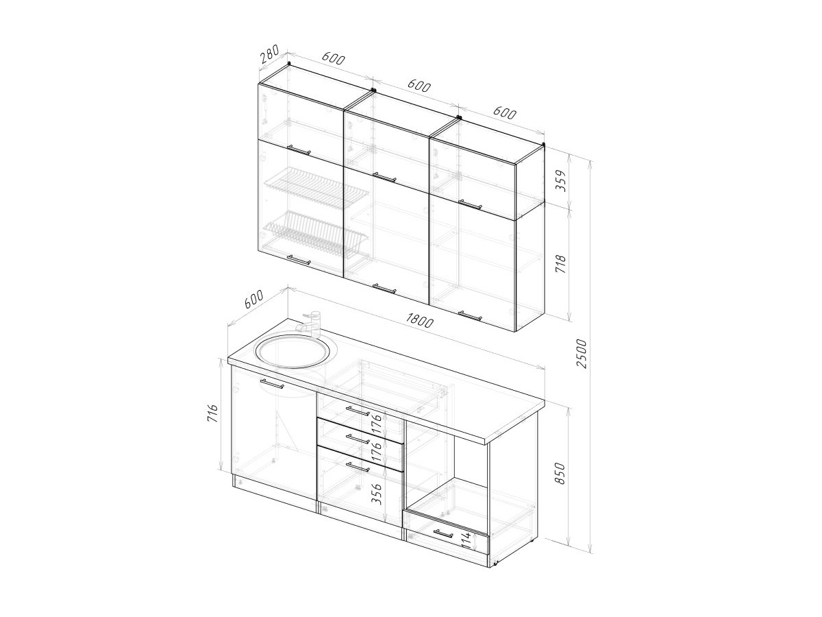 Мойка, смеситель, стеновая панель и посудосушитель в комплект гарнитура не входят.