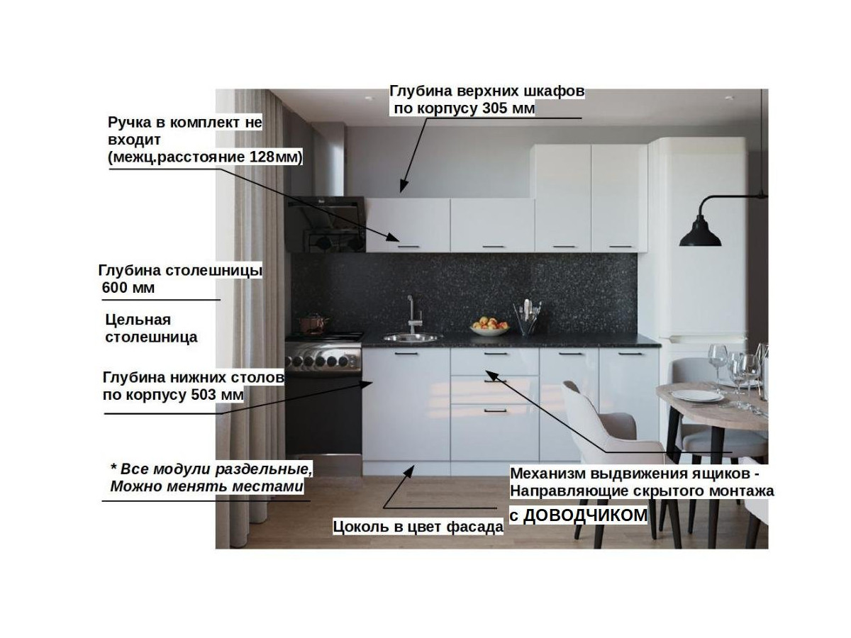 Кухонная мойка, стеновая панель, посудосушитель, планки для столешницы в комплект не входят.