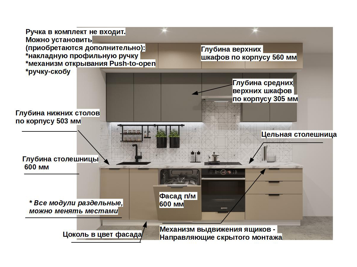Кухонная мойка, стеновая панель, посудосушитель, планки для столешницы в комплект не входят.