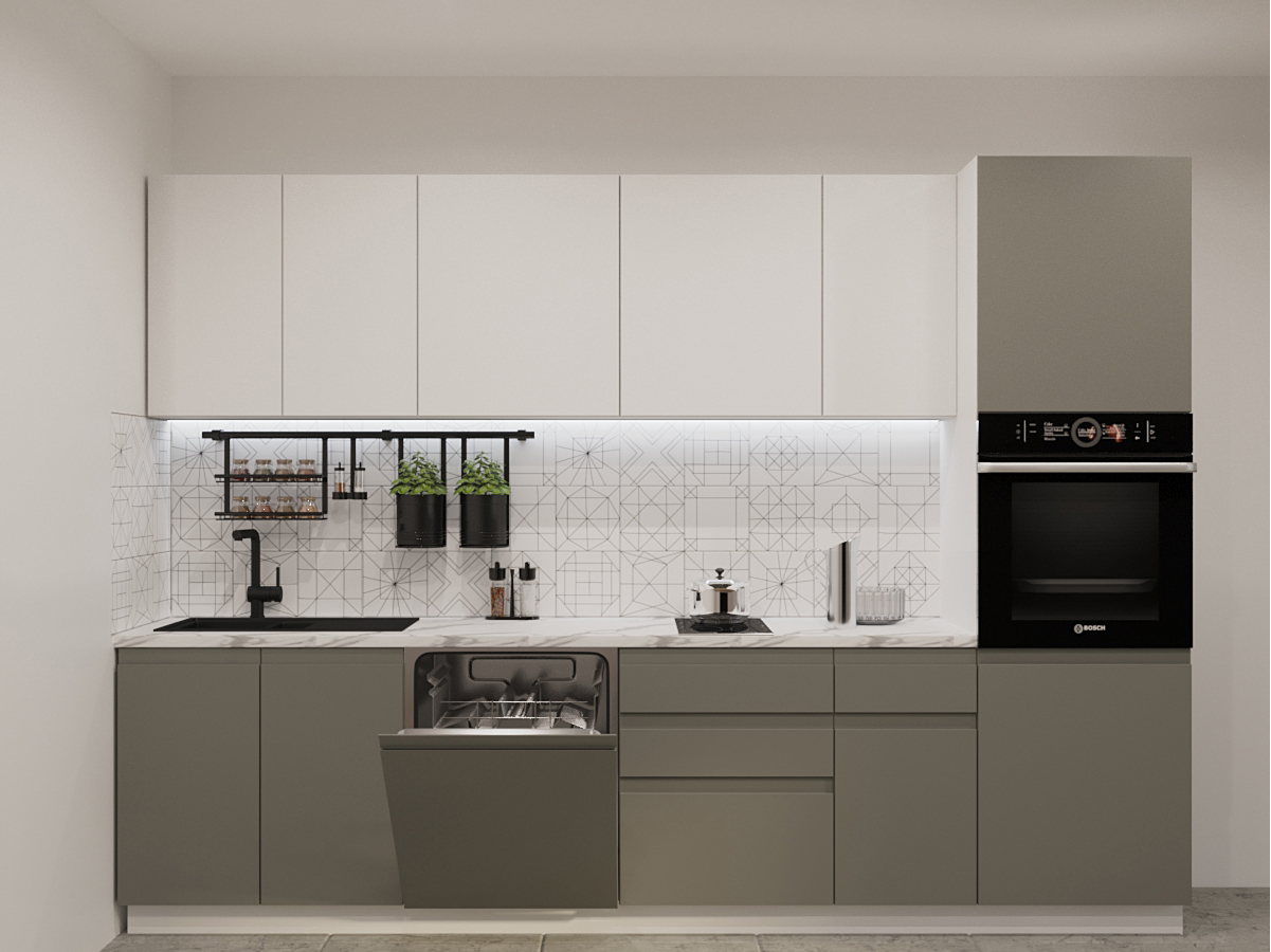 Кухонная мойка, стеновая панель, посудосушитель, планки для столешницы в комплект не входят.