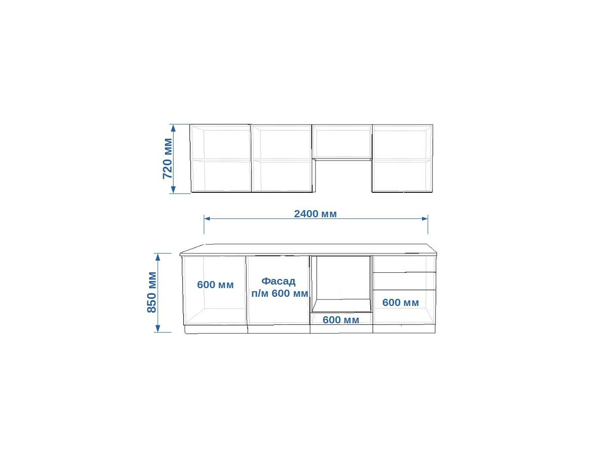 Кухонная мойка, стеновая панель, посудосушитель, планки для столешницы в комплект не входят.