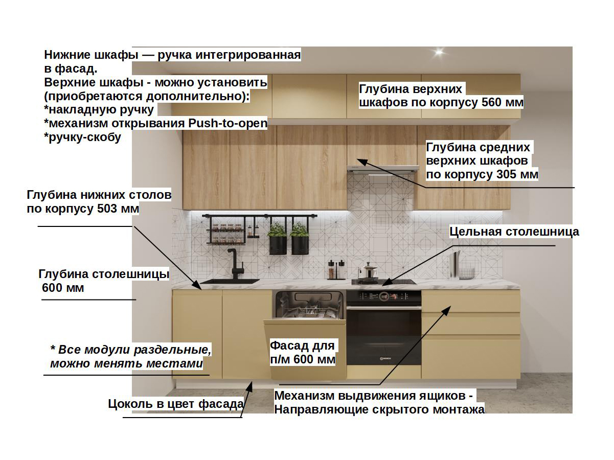Кухонная мойка, стеновая панель, посудосушитель, планки для столешницы в комплект не входят.
