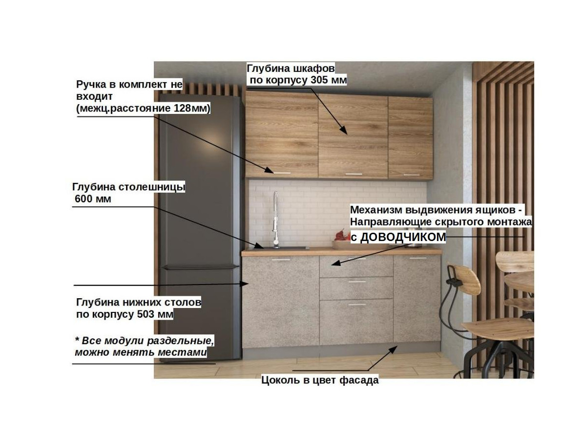 Кухонная мойка, стеновая панель, посудосушитель, планки для столешницы в комплект не входят.