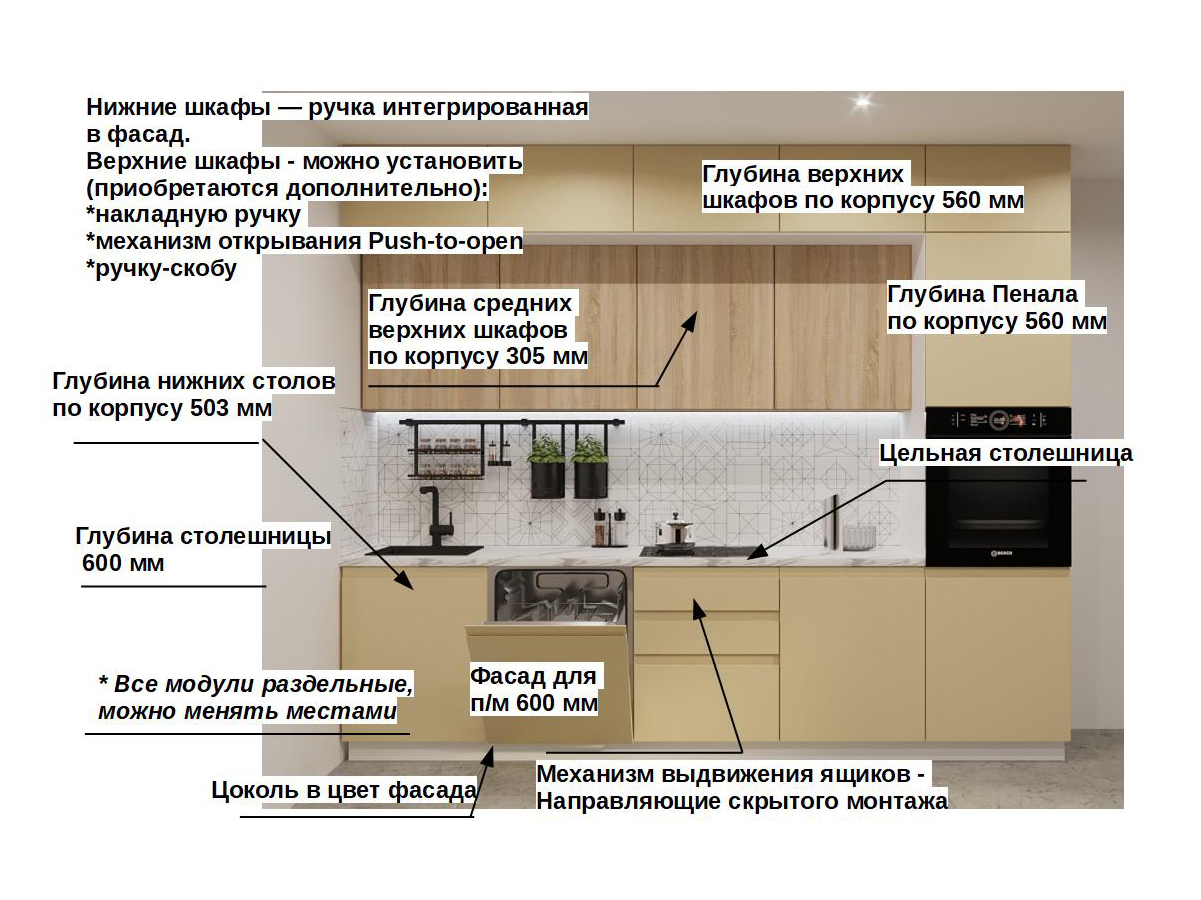 Кухонная мойка, стеновая панель, посудосушитель, планки для столешницы в комплект не входят.