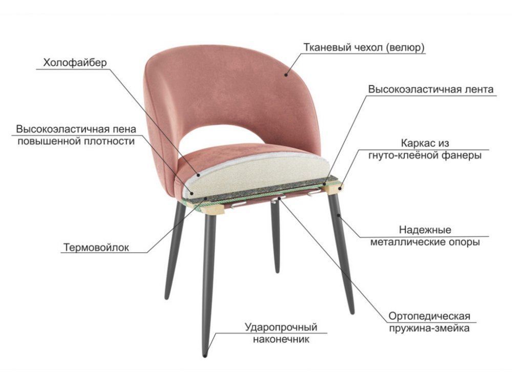 Анатомически правильная спинка и сидение с пружинящим эффектом очень комфортно при посадке. Приятный на ощупь велюр, стильный кант по периметру стула, подчеркивают плавные формы стула.