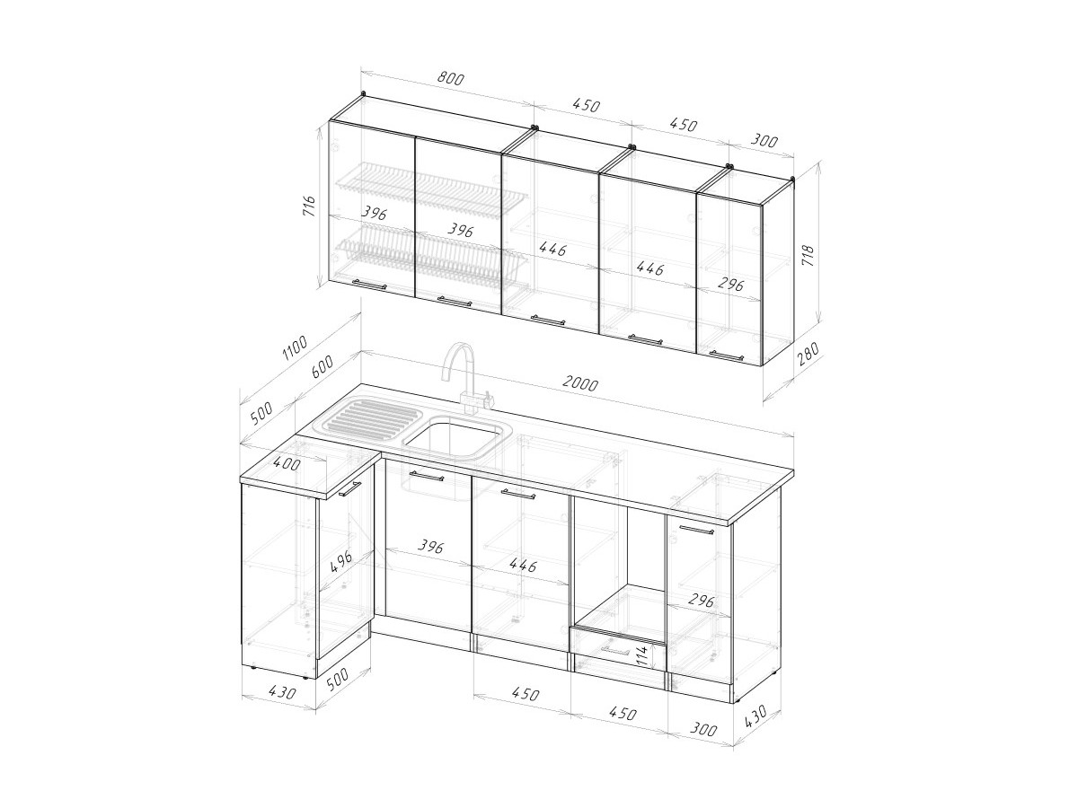 Мойка, смеситель, стеновая панель и посудосушитель в комплект гарнитура не входят.