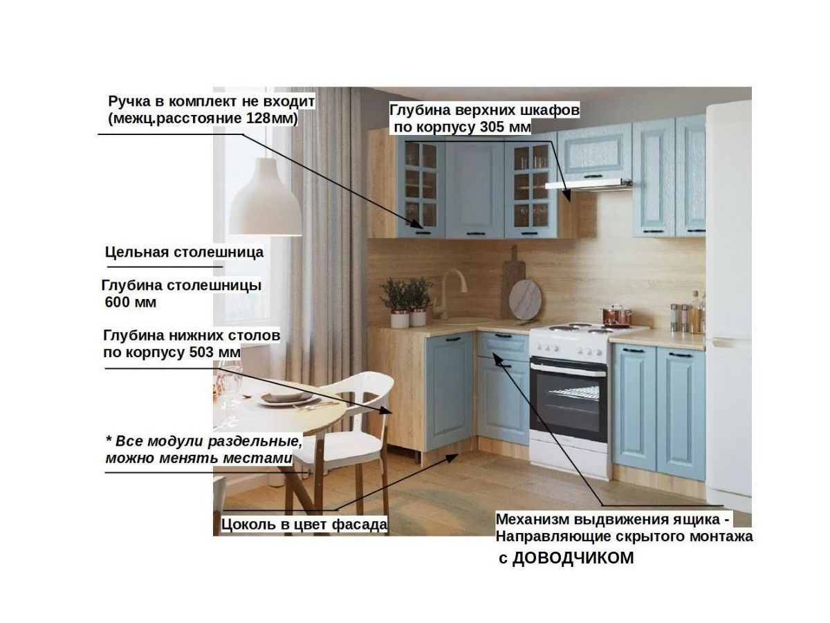 Кухонная мойка, стеновая панель, посудосушитель, планки для столешницы в комплект не входят.