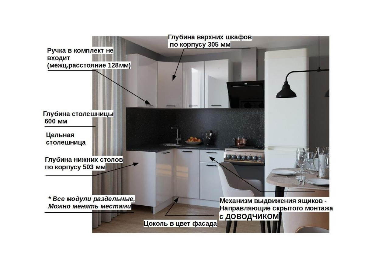 Кухонная мойка, стеновая панель, посудосушитель, планки для столешницы в комплект не входят.