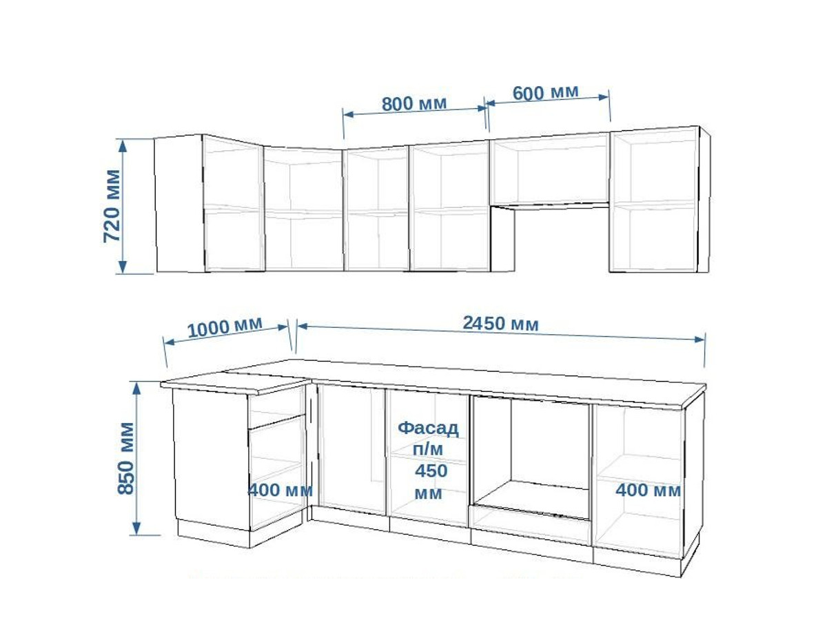 - высота верхних шкафов 720 мм