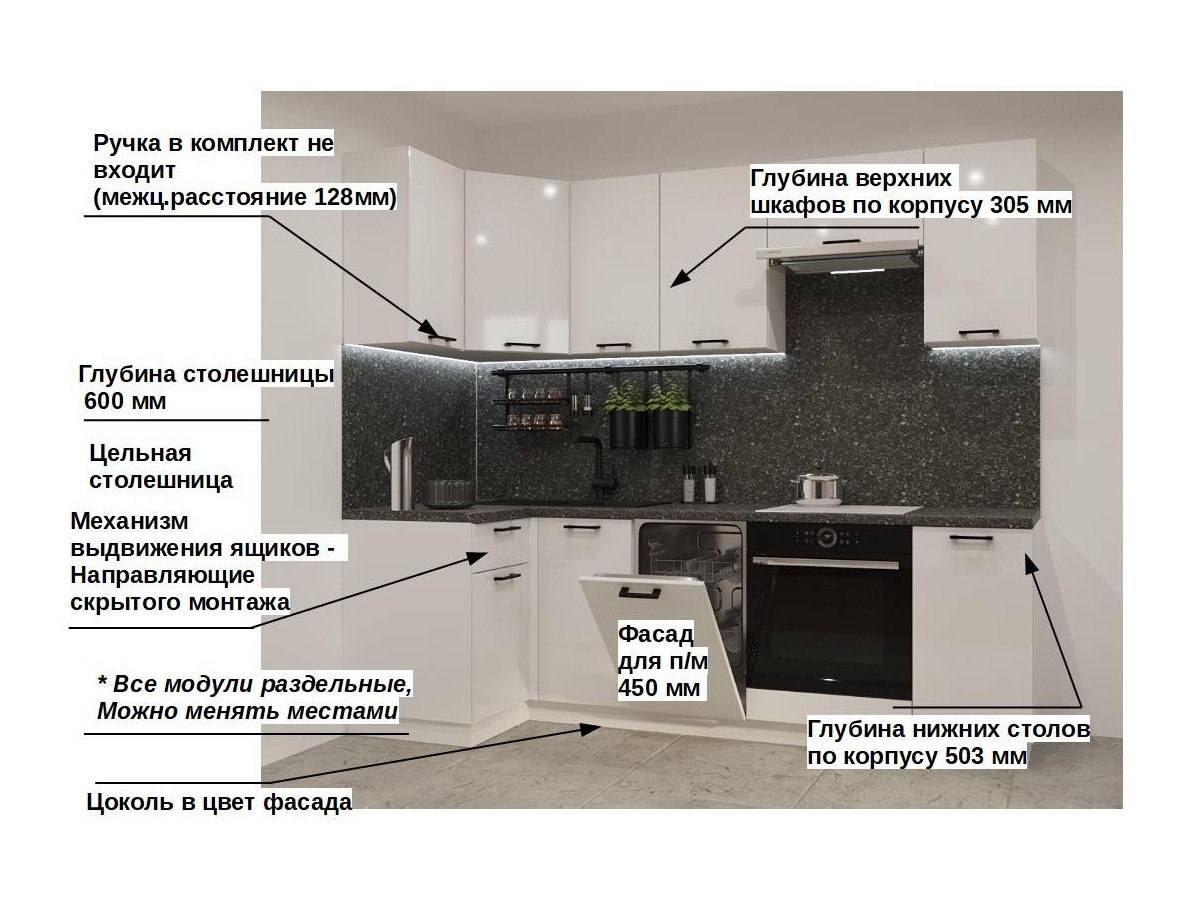 Кухонная мойка, стеновая панель, посудосушитель, планки для столешницы в комплект не входят.