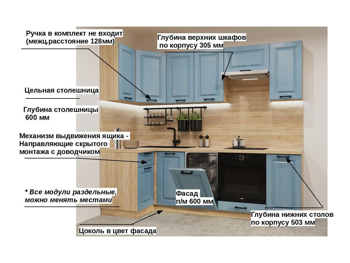 Кухонная мойка, стеновая панель, посудосушитель, планки для столешницы в комплект не входят.