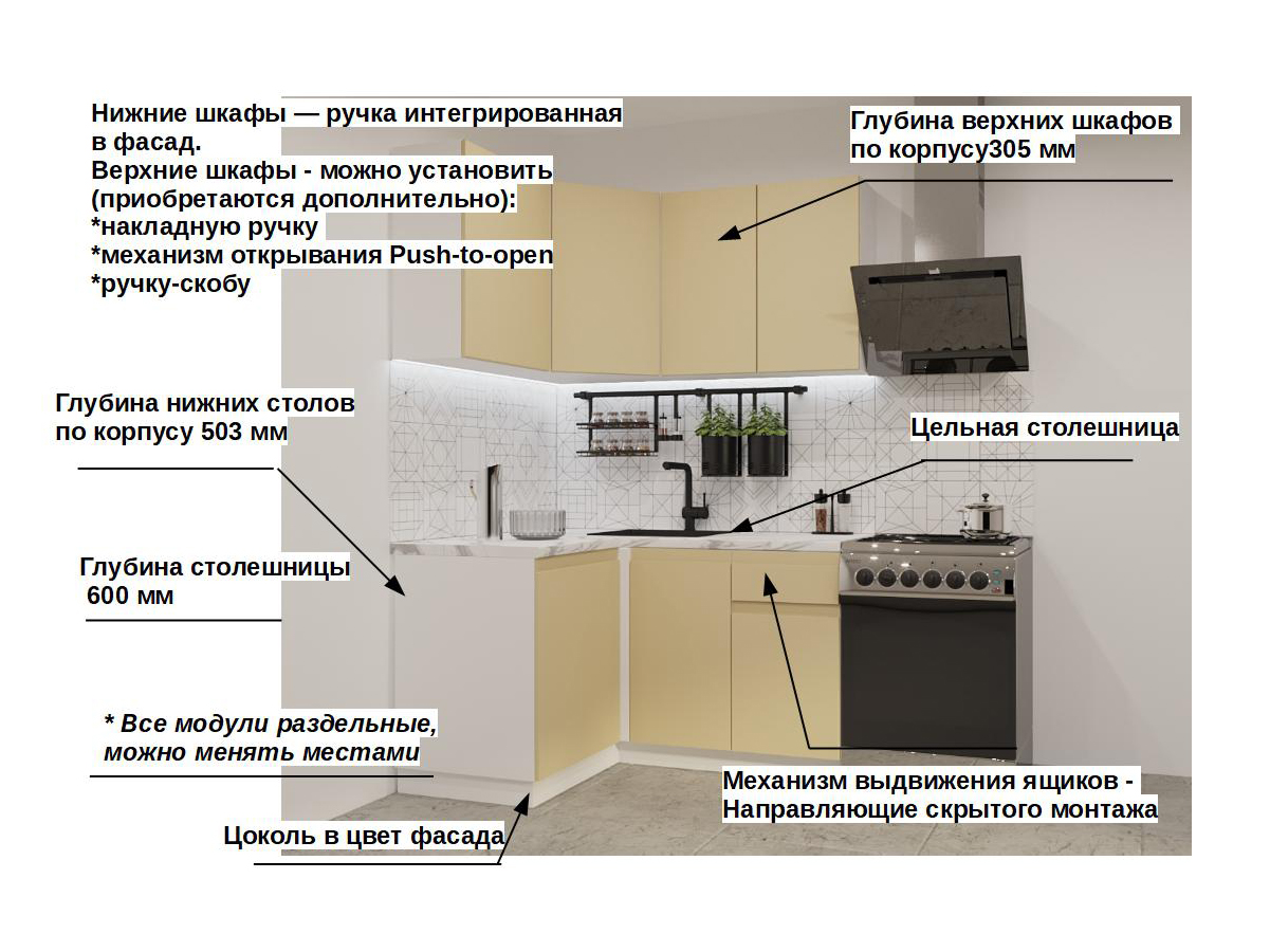 Кухонная мойка, стеновая панель, посудосушитель, планки для столешницы в комплект не входят.