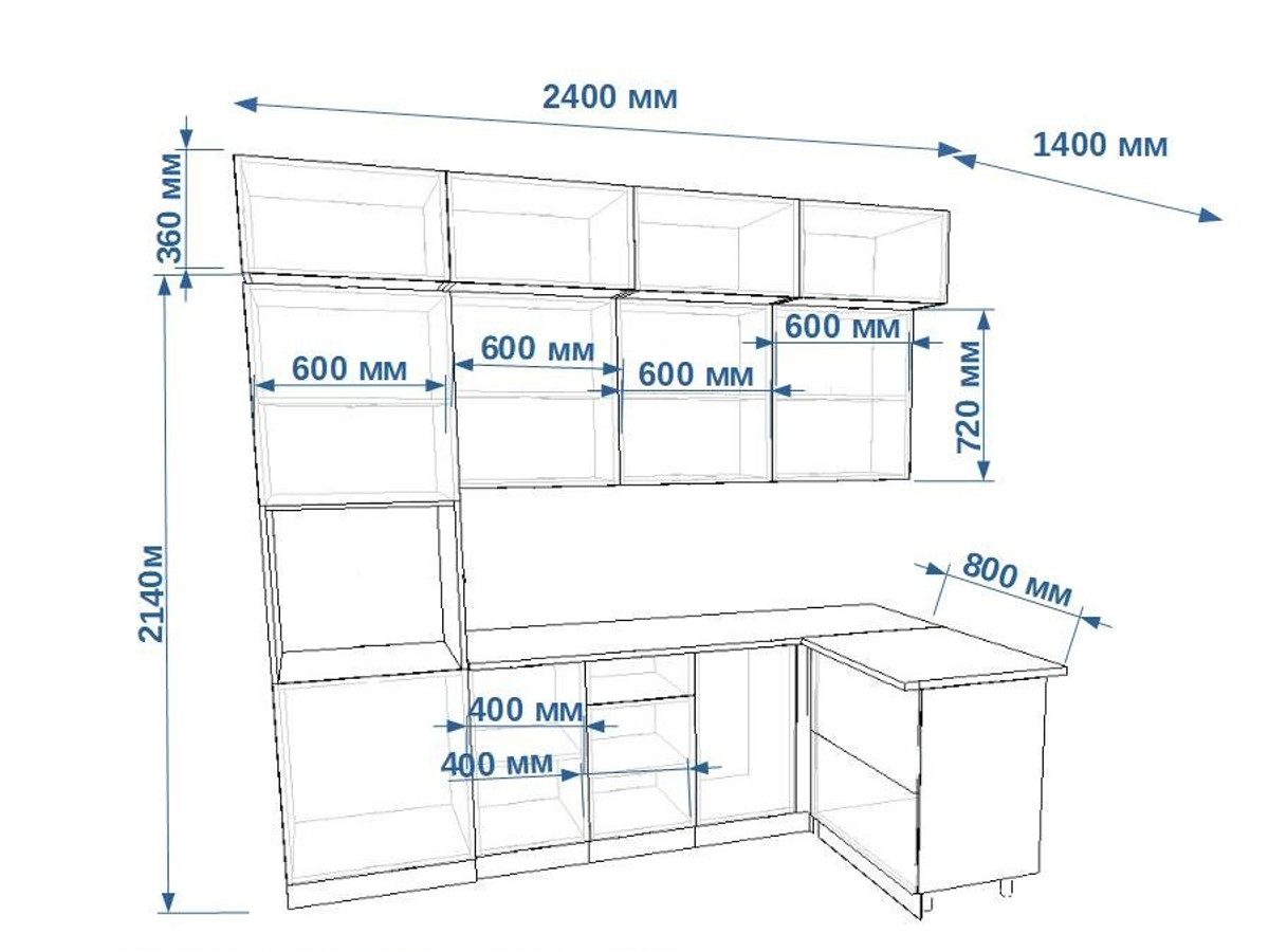 - высота верхних шкафов 720 мм