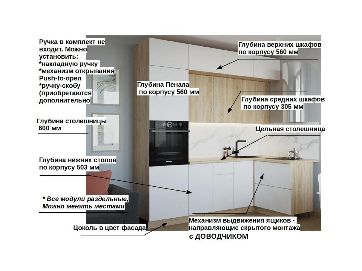 Кухонная мойка, стеновая панель, посудосушитель, планки для столешницы в комплект не входят.