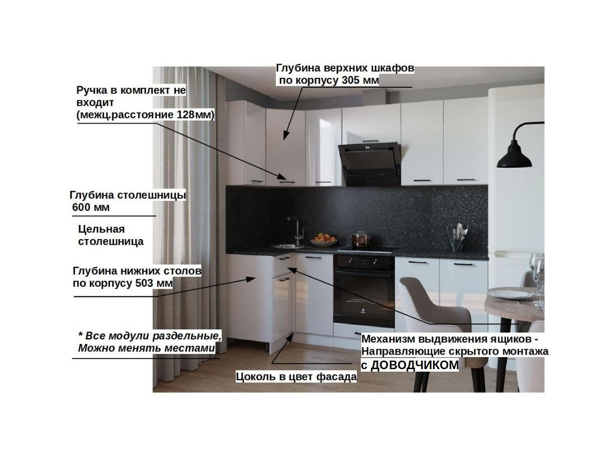 Кухонная мойка, стеновая панель, посудосушитель, планки для столешницы в комплект не входят.