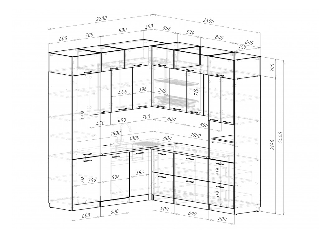 Мойка, смеситель, стеновая панель и посудосушитель в комплект гарнитура не входят.