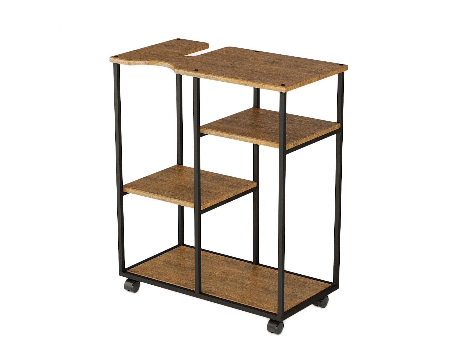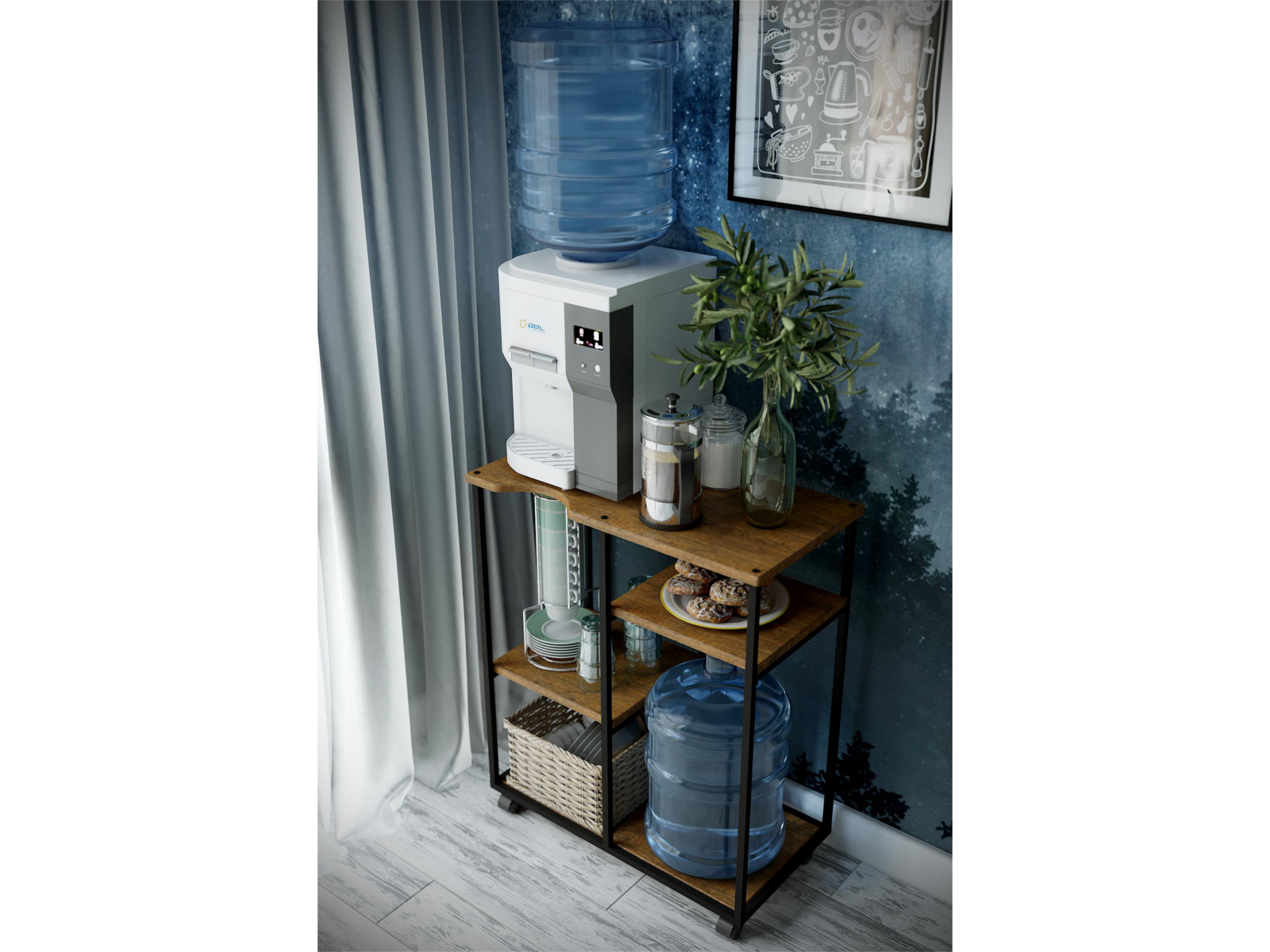 Сборно-разборный каркас подставки изготовлен из профильной трубы 15*15 мм, полки выполнены их экологичного материала МДФ. Данную подставку можно использовать и для кулера, и для бутыли, и сочетать бутыль с кулером и дополнительной бутылью, т.е. многофункциональность данной подставки позволяет использовать её как дома, в офисе или любом помещении для удобного и грамотного размещения воды. Основание подставки на роликовых опорах.