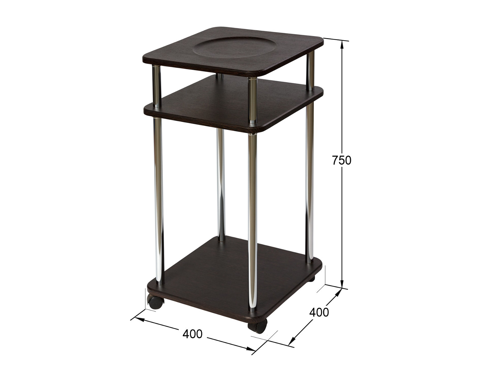 Подставка под кулер выполнена из материала МДФ 16 мм, опоры-хромированная туба. Высота подставки 750 мм, основание, полка и столешница имеют квадратную форму размером 400х400 мм. Подставка мобильна благодаря основанию на колесной опоре. Данная модель дополнена регулируемой по высоте полкой. Подставка рассчитана на кулер с бутылью и еще на одну запасную бутыль, что очень важно для экономии места дома или офиса.