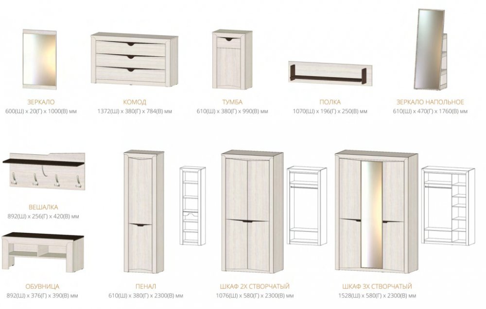 Цена указана за комплектацию на фото: Зеркало, Тумба, Вешалка, Обувница, Пенал